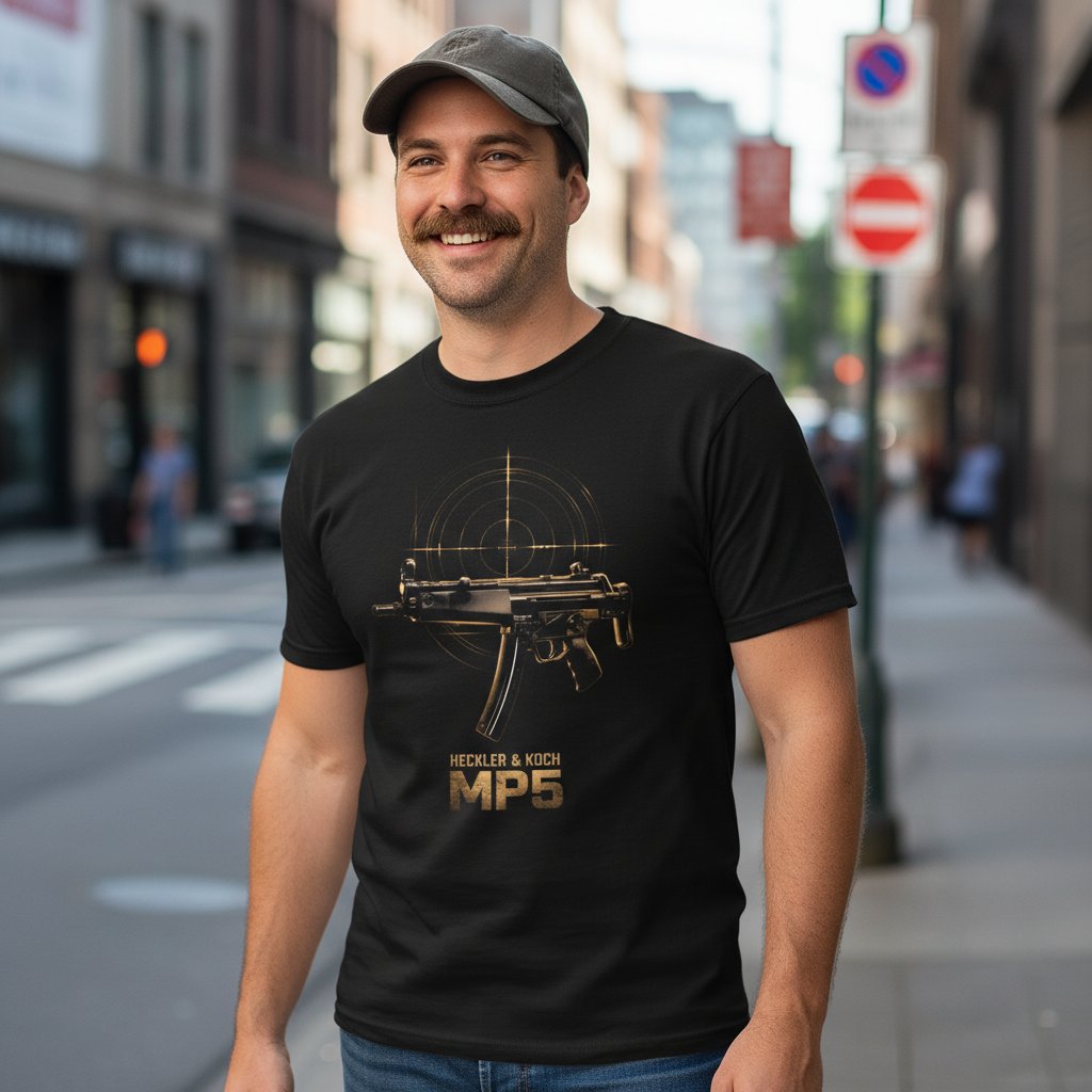 Černé bavlněné tričko o gramáži 160g/m2 s vypracovaným originálním motivem Heckler & Koch MP5. Tričko pro akční nadšence, ale i pro milovníky retro motivů.