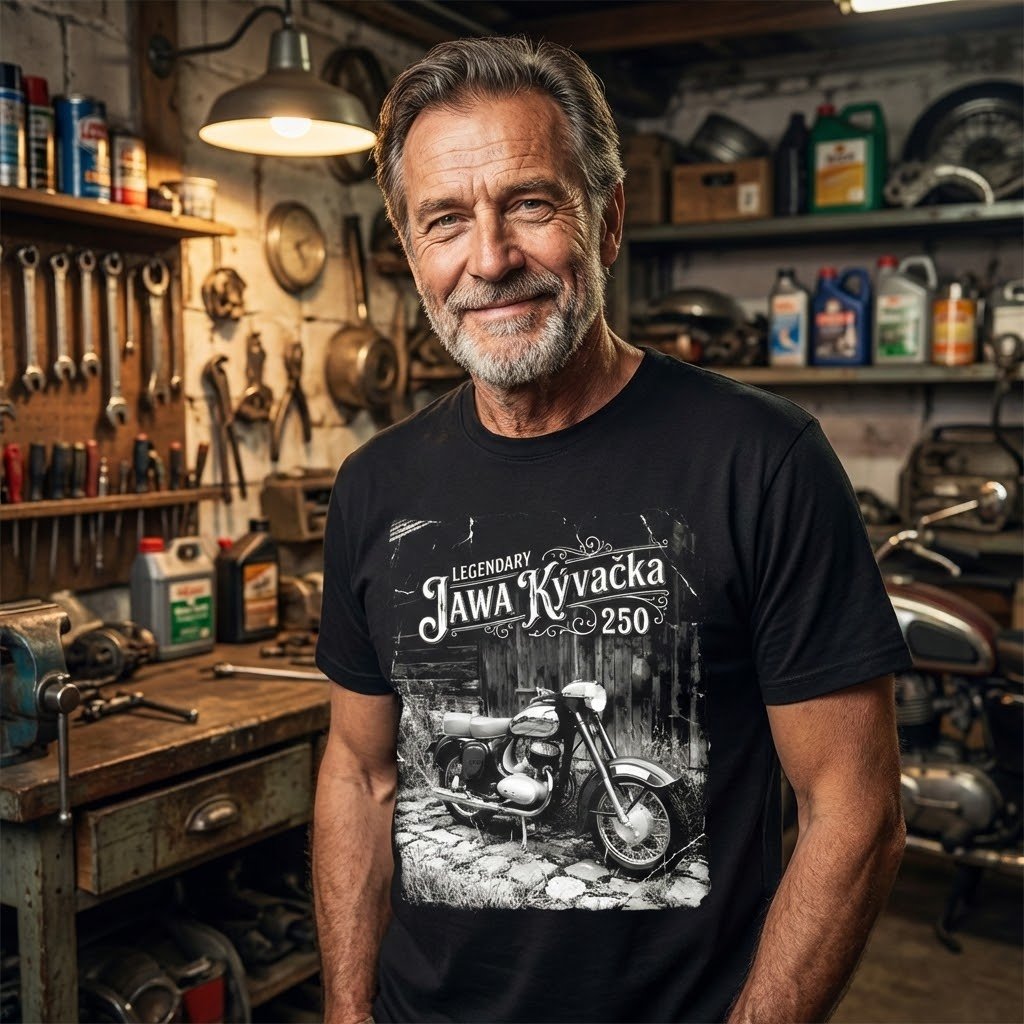 Bavlněné tričko o gramáži 160g/m2 s vypracovaným originálním motivem JAWA 250 kývačka - legendary. Tričko pro auto-moto nadšence, ale i pro milovníky retro motivů.